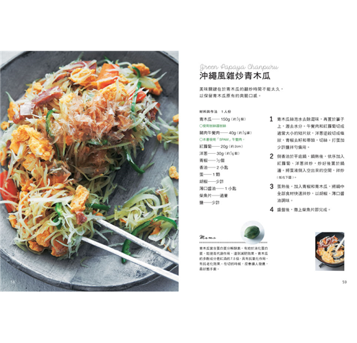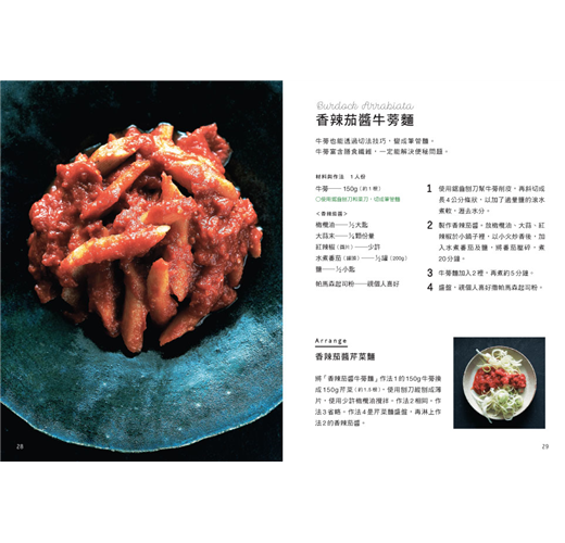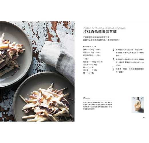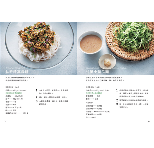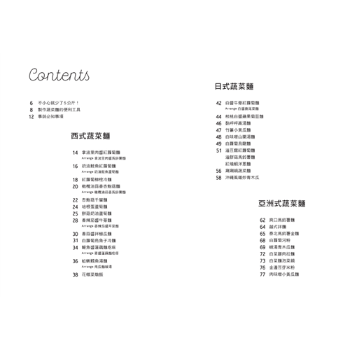 書中介紹了33道全程以蔬菜製成的麵食,兼顧各種口味的愛好,分為歐美風格及亞洲風格,作者更加碼分享了16道無國界常備小食,無論是作為三餐配菜或是派對輕食點心,都能滿足挑嘴的你。