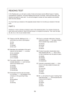 ①PART 5的範圍從第101題到130題,共有30道試題;PART 6從第131題到144題,每大題各由4道試題組成,共有四個大題。PART 5以商業狀況、日常生活常見的短文(平均由13~25個單字組成),測試考生對其中出現的字彙與基本文法之理解;PART 6要求考生針對出現於信件或電子郵件、備註、新聞報導等長文裡的四個空格,選出符合文法及脈絡的字彙或適當的句子。