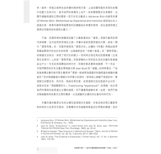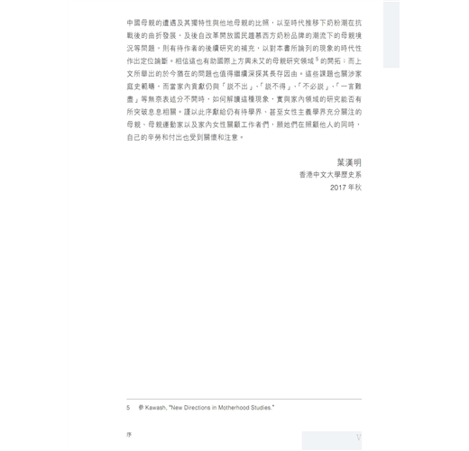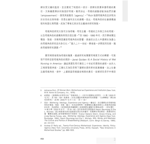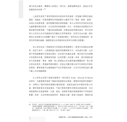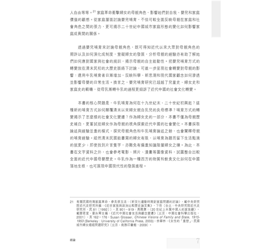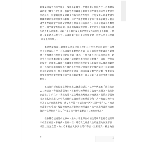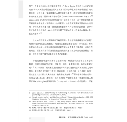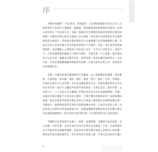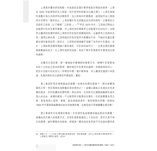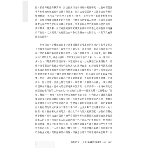 本書作為婦女史的一部分,不僅為母親歷史補白,更是以婦女作為母親的眼光探索近代中國的社會變化。本書採取論述與經驗並重的模式,分析母親角色和牛乳哺育論述之餘,也會闡釋母親的哺育經驗。清末民國能書寫的婦女有限,以哺育為題而留下生活點滴的就更少;即使找到片言隻字,亦難免有偏重知識階層婦女之嫌。