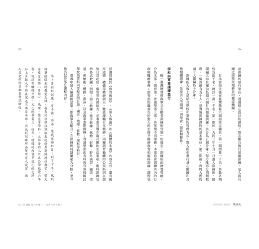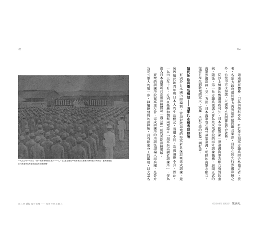 志願兵制度伸向臺灣/精兵式海軍志願兵/海軍特別志願兵制度/「行かう!海軍志願兵」—志願兵招募宣傳/愛國青年的響應/警察大人強制「自願從軍」/學校機關的「集團志願」/破除「水」禁忌/海洋訓練隊的創立/從恐懼海洋到海洋青年/海軍預備訓練/志願兵的申請資格/嚴格的甄選流程/殖民地新兵養成機關—海軍兵志願者訓練所/學科與軍事操練並行/兵種的選擇/廢除訓練所/高雄海兵團/月月火水木金金—海軍訓練/按表操課的軍隊生活/震撼的「軍人精神注入棒」
