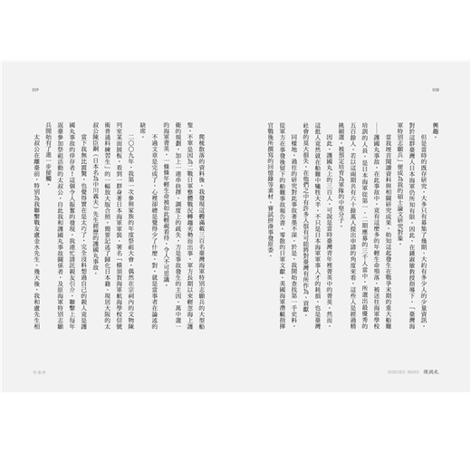 本書作者才三〇出頭,而非一般想像中的中年研究者,卻從研究所時期開始便針對二戰末期臺籍日本海軍之護國丸事件開始收集相關史料,因而開啟一段他與日治時期海軍的緣分,甚至透過研究,發現護國丸事件其中一位倖存者,竟然是自己血緣上的太叔公。