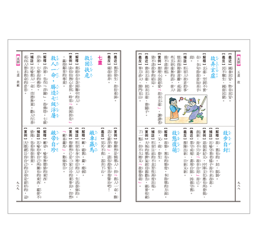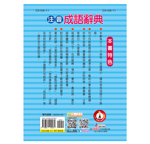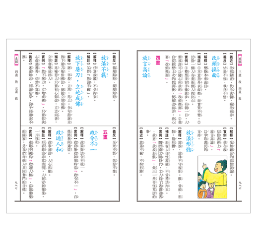 辭典分上、下兩冊,收錄國中小常用成語六千餘個,每個成語包含解釋、補註、實例、義近、義反等,說明精簡扼要,內容淺顯易懂。全文均附教育部公布標準注音,幫助學生輕鬆閱讀,五百餘張的彩色插圖,幫助讀者更容易了解成語的內容,提升學習的興趣。書末附錄豐富,提供多方面的知識。全冊內容豐富實用,是您學習成語不可或缺的好幫手。全文注音,閱讀方便全彩印刷,版面清晰內容豐富實用,提升學習力