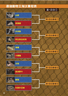 即將展開陸上生物霸主「最強動物王」、水中生物霸主「水中王」、地球上數量最多的節肢動物霸主「節肢動物王」等三項王座的對決爭奪。精采的比賽就要開始,透過一連串動物對戰的模擬情境,介紹生物們豐富有趣的相關知識,詳細解說動物的力量、凶猛度、強度,同時也能知道為了生存,練就了哪些驚人的能力。