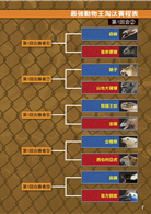 事實上這一回合可以說是決賽的組合。非洲象與阿拉斯加棕熊的棲息地天差地遠,雖然在真實世界無法相遇,但如果雙方開戰將會如何呢?這將是一場精采可期的對決。獲勝的是龐然大物的非洲象,還是有致命猛拳的阿拉斯加棕熊呢?第2戰的舞臺為延續第1戰所設定的草原。