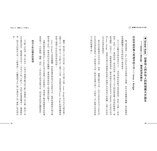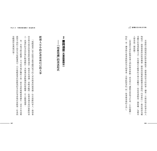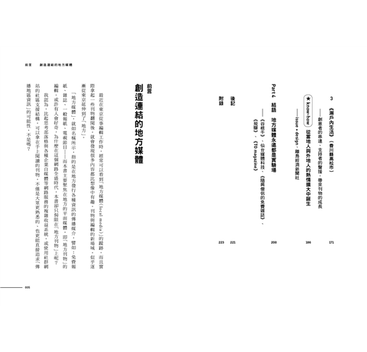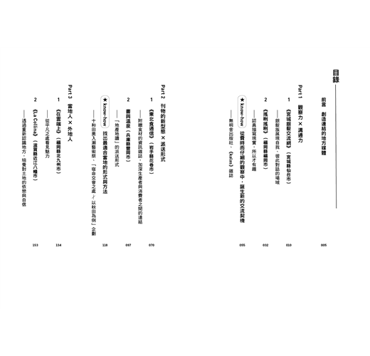 透過「觀察力×溝通力」「全新形態的刊物×嶄新的傳播形式」「當地人×外地人」三章節,將不僅更加了解地方刊物的編輯如何挖掘出有趣或深度題材,也能感受到蘊含在地方刊物社會責任之中的蓬勃力量,更看到一份地方刊物的熱情與浪漫理想,如何實際牽起人與人之間的心念、甚至是復甦了地方的活力。