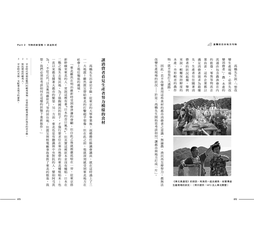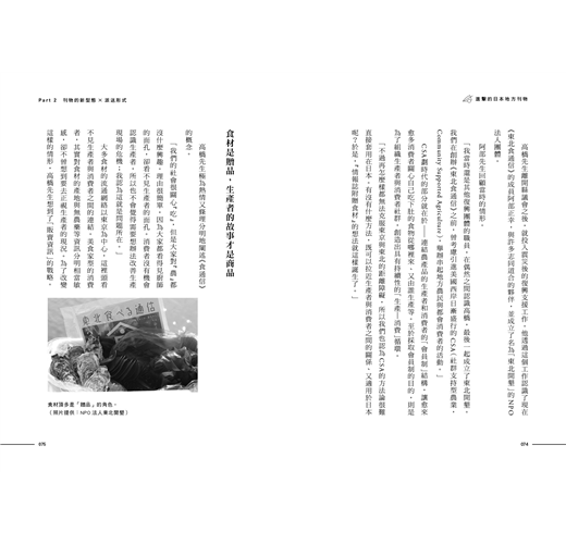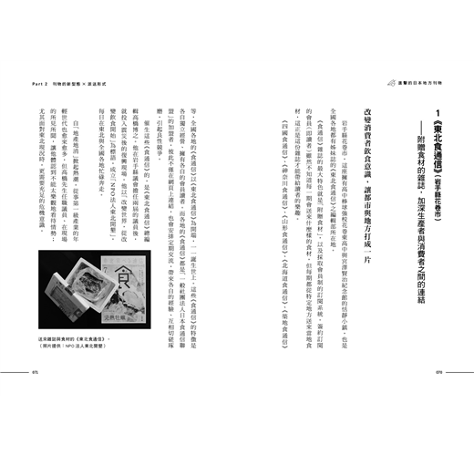 附贈食材的四開版情報誌《東北食材通信》就基於這樣的想法發行。這份雜誌自創刊號石卷市的「完熟牡蠣」特輯以來,會員數持續成長,順利突破一四○○人,到了二○一四年更獲頒優良設計獎(Good Design Award)金獎。將宅配服務轉換成資訊服務的戰略確實絕妙,利用媒體協助振興第一級產業的想法也很有趣。但是《食材通信》的魅力不僅止於創意本身,更在於頻繁往來現場的紮實採訪。每期的封面故事都是挖掘地方歷史、如實傳達生產現場的文章。「漁夫與傳統表演藝術歌舞伎是一體兩面」「高麗蔘是京都守護職會津藩的廚房後盾」等標題也相當吸引讀者。