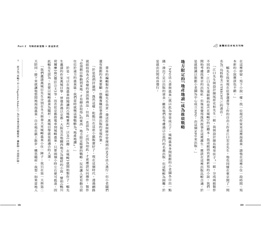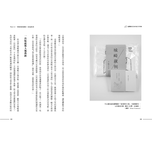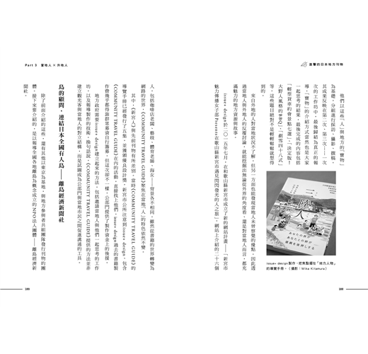影山裕樹經採訪、蒐整,精選超過十五則日本地方刊物的案例成書,以地方刊物之「發現在地的魅力」、「嘗試發行型態的新實驗」與「促進外地人與當地人的交流」三大特色,詳細介紹每一個案例的發源背景、尋找企劃題材的方法、適合在地的傳遞派送管道、刊物如何讓一地面貌有了一百八十度的轉變影響等等,讓讀者得以在紙上參與了一次地方刊物自胚胎萌生到茁壯成熟的完整過程。