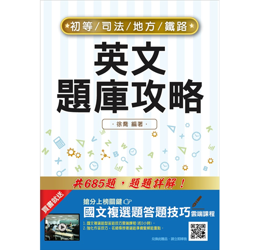《英文題庫攻略》是一本豐富的題庫攻略本,內有英文相關考題685題,每題皆有詳細解析,是初五等考試、鐵路特考的考生備考的捷徑之選。