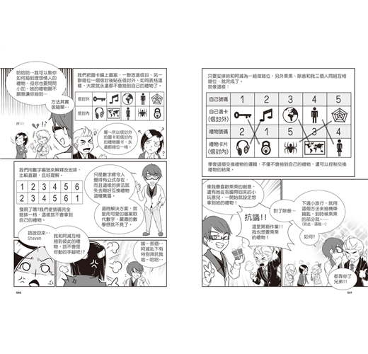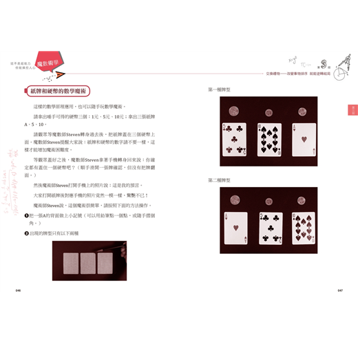 各界好評聯手推薦 (依姓氏筆畫排序) ◆解決生活難題的新易經 國立彰化師範大學教育?究所所長/林國楨先生 以漫畫穿梭於數理情境之間,將數學魔術貫穿科普小說之中,此書兼具趣味性與教育性,徹底打破數學是一門艱澀難懂的科目,有如現代版的「新易經」! ◆魔數世界的魅力 國立台灣師範大學數學系退休教授/洪萬生先生 數學知識的獨特之處,在於它無法描述大自然,但應用時,卻發揮了「不可思議的有效性」(incredible effectiveness)。不過,這種有效性通常不一定會及時出現。因此,數學知識的探索如何讓數學家「無怨無悔,終身以之」,這就恐怕與它對吾人不時地引發「意想不到的」驚奇(wonder)有關吧! 這種「驚奇」經常源自吾人極簡單的推論,卻得到出乎(直覺)意外的結果。事實上,吾人一旦掌握了模式(pattern),通常可以經由簡單的邏輯推論,洞察一般人所難以想像、甚至看不見的數學世界真相。這種推論vs.直覺的對比,的確是數學這門學問所獨有,只是過去的數學家或數學教師或許對於數學的抽象過分「拘謹」,而不太習慣使用「有趣的」進路或手法,來分享世間處處皆驚奇的數學經驗吧! 現在,基於數學普及的深刻關懷,許多數學家及數學教師開始向魔術師取經,學習他們的「魔幻」手法,以「數學魔術」來帶領「真實」但令人驚奇的數學知識活動。這種「雙重驚奇」的疊加或相乘效果(magic + wonder),在在考驗著表演者的數學素養及魔術技巧。在YouTube TED上頗受歡迎的數學家亞瑟?班傑明(Arthur Benjamin),就是一個絕佳典範。國內將「數學魔術」從一種純粹娛樂的表演,提升為一個有意義的數學知識活動(activity)過程中,本書作者莊惟棟老師是在背後支撐的最重要力量。 惟棟精通魔術,我沒想到他也是數學出身,因此,他自稱魔數師,絕對當之無愧!不過,在這本《魔數術學》中,惟棟還敘說了一個非常動人的愛情故事,令人刮目相看。事實上,這本也可以歸類為數學小說的創作以敘事為緯,以魔術表演及其數學解說為經,後者可以各自獨立,但藉由前者而連貫成為一體。同時,有些魔術或數學也融入或成為故事情節(plot),而成為欣賞這本小說不可缺少的一環。 總之,這是一本相當精彩的數學小說,書中角色各司其職,讓暖男型的主角利用數學魔術來穿針引線,敘說一個數學型的才子佳人故事,讓我們數學人感覺十分窩心。我也相信「數學+魔術+暖男」的三合體,一定可以帶給讀者空前驚奇的享受,因此,本書值得我們鄭重推薦! ◆難以抗拒的數學體驗 國立台灣師範大學數學系教授/郭君逸先生 利用漫畫的形式來呈現數學小說,提升科普數學閱讀樂趣,內容豐富又有魔術,一定能給喜好魔數的你,有另一番的感受;也能給不喜歡數學的你,重新認識它的帥與美! ◆能夠撫慰人心 讓人快樂就是魔術的價值 UniMath總編輯/陳宏賓先生 記得小時候第一次接觸到魔術,是小學三年級同學帶來的魔術道具,把硬幣放在杯子上面,蓋子蓋起來,再掀開時硬幣就消失了!這個簡單的魔術道具,當時卻令我情緒激動,從此只要有人變魔術,一定上去圍觀,非常好奇背後的祕密究竟是甚麼。 從小到大,看過許許多多的魔術,可我從來沒有想過魔術竟然可以跟數學有關?!零星見過一兩個數學魔術;不過,遇到作者惟棟老師之前,我不相信有人可以一個又一個的把數學式子變成精彩的魔術表演。惟棟老師做到了! 這本書集結了許多數學魔術,外包裝是精美的魔術漫畫,內容物是你未曾留意的數學原理。透過這樣的組合來認識數學,是非常特別的體驗,如果對數學不好的學生施展的話,我相信效果必定相當顯著。 好友惟棟老師本身是數學教育實踐者,我知道他經常錄製數學魔術表演,並且在課堂上表現魔術引起學生的興趣和求知慾望。這本書最吸引我的地方,數學魔術只是其一,令我感動的是用魔術幫助身旁重要的人的故事安排,正如惟棟老師所在的教育現場。 能夠撫慰人心、讓人快樂才是魔術珍貴價值所在。 若你是個沒有體驗過數學樂趣的學生,我推薦這本書! 若你是個經常面對興趣缺缺的學生的數學教育工作者,我推薦這本書! 最後,向所有想要讓身邊的人幸福歡笑的人,推薦這本書! ◆見證奇蹟時刻 國際魔術大師/劉謙先生 看完這本書,令人覺得數學就是魔法,原來見證數學就是見證奇蹟的時刻。 ◆悠遊魔數的動機鍛造師 國立台灣大學電機系教授/葉丙成先生 在我教書的前十年,我一直認為教書教得好就是講課講的清楚、有趣。我也不斷的往這方向努力。但努力十年後,我發現即使講課講得很清楚、有趣,總還是會有學生無法進入學習狀況。這讓我非常苦惱,為什麼教課教得精彩,還是無法讓學生願意好好學習呢? 經過不斷地反思,我終於體悟。如果學生對課程沒有學習動機,老師的課講得再清楚再有趣,都是枉然。也因為這樣的體悟,過去八年來,我一直在往這個方向努力。除了在自己的課設計方法幫助學生找到學習動機,也希望能夠幫助更多中小學老師了解幫學生建立學習動機的重要性。 在所有的科目當中,我一直認為最不容易幫孩子找到學習動機的,就是中學數學。其他的科目,或是容易跟真實人物事跡連結,或是可以做實驗觀察現象。但中學數學有許多內容,不是那麼容易在日常生活中找到實際案例連結,建立學習動機。比如配方法、一元二次方程式等,這些都不是那麼容易讓孩子有興趣好好學的數學章節。要能讓