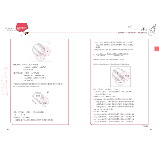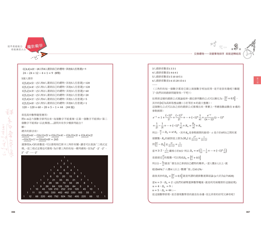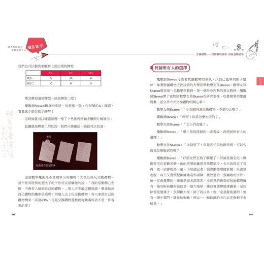 ◆手機增溫術→10秒破冰術 贏得好人緣 ◆鬥智必勝術→善用九宮格策略 從不輸求和到獲勝 ◆交換禮物→改變事物排序 就能逆轉結局 ◆巧緣相印→善用數列歸納邏輯 對應出理想的結局 ◆拒絕的藝數→贏家用人際互動化解敵意 輸家習慣用經驗判斷輸贏 ◆生日快樂→不是每件事都要有結果 最美的是不後悔的回憶 ◆占卜數→執著而不固執 放下而不放棄 ◆心電感數→聊天時請用YES設問法 聊出真心話人際不卡關 ◆八卦測字→別讓眼前的壞事 趕走未來的好事 ◆讀心數→所有的美好都不會因你留下 是因你的留心就能見到美好 ...