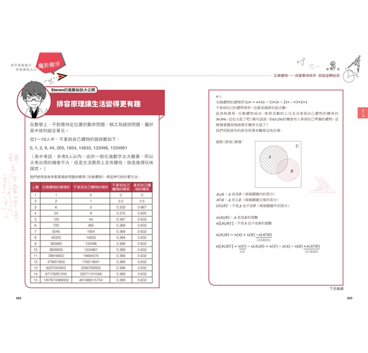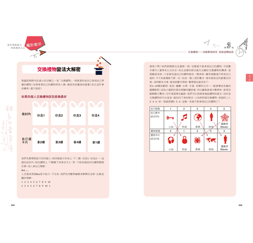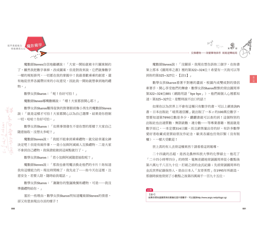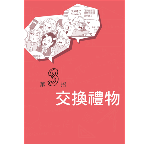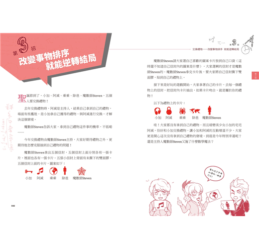 ◆手機增溫術→10秒破冰術 贏得好人緣 ◆鬥智必勝術→善用九宮格策略 從不輸求和到獲勝 ◆交換禮物→改變事物排序 就能逆轉結局 ◆巧緣相印→善用數列歸納邏輯 對應出理想的結局 ◆拒絕的藝數→贏家用人際互動化解敵意 輸家習慣用經驗判斷輸贏 ◆生日快樂→不是每件事都要有結果 最美的是不後悔的回憶 ◆占卜數→執著而不固執 放下而不放棄 ◆心電感數→聊天時請用YES設問法 聊出真心話人際不卡關 ◆八卦測字→別讓眼前的壞事 趕走未來的好事 ◆讀心數→所有的美好都不會因你留下 是因你的留心就能見到美好 ...