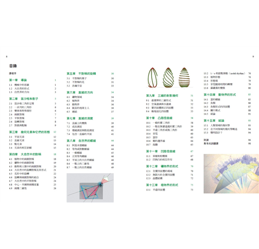 對於射影幾何稍作說明後,我們再回到《跟大自然學幾何》的介紹。本書共分十五章:第一章導論介紹本書的意旨,想要處理的問題以及採取的進路。第二章介紹笛沙格定理,這是射影幾何的基礎,但作者對於理論著墨不多,而是用了許多實作的圖形,說明利用笛沙格定理如何將自然中的對稱性,如兩側對稱、平移對稱、旋轉對稱等等形式給予一般性的框架。此外,也說明射影幾何中的基本原理――對偶(配極)原理。簡言之,點和直線在平面上會成立的性質,平面和直線在點上也會成立。這個原理使得我們可以轉換觀看的視角。作者認為:「點是我們文化最喜歡的元素,……,細胞、分子、原子,甚至是次原子粒子這些微小之物,它們被認為可以提供關於整體的答案……這種化約論中存在著某種悖謬,也就是當我們越往小的部分去,我們看到的就越少;當整體被化約成部分後,脈絡就消失了。」這正是第三章所討論的重點,對應於自然界的脈絡,分成平面元素、直線元素、點元素,以及三者彼此相互作用的形式。第四章和第五章,作者則是取用許多自然界的實例,從(不)對稱性來驗證先前介紹之數學工具的可行性。
