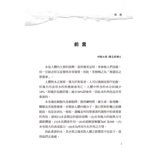 水是人體內主要的溶劑。當供應充足時,常會被人們忽視,但一旦缺乏時又是覺得非常需要,因此,常被稱之為「被遺忘之營養素」。