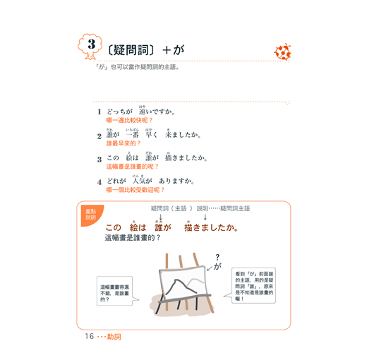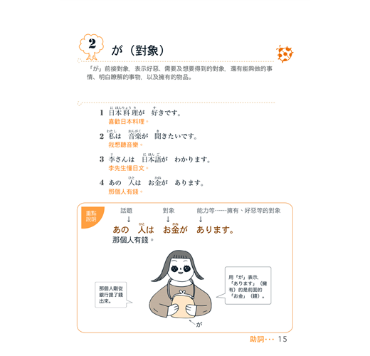 2. 得分王─考點很明白:本書為初階文法學習書,與新日檢N5考試程度相同。考題中大都會有兩個較難的意思相近的選項。為此,書中精選較常出現、又讓考生傷透腦筋的相近的文法進行比較。而它們之間有哪些微妙的差異,同一用法又有什麼語感上的區別等等,在此為您釐清,讓您短時間內迅速培養應考實力。