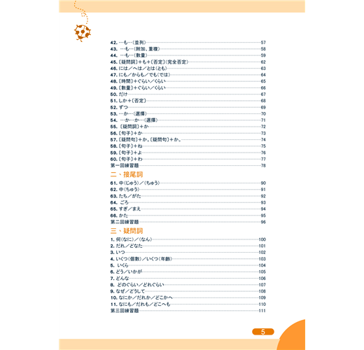5. 測驗王─全真新制模試自我檢驗:三回全真模擬考題將按照不同的題型,告訴您不同的解題訣竅,讓您在演練之後即時得知學習效果,並充份掌握學習方向。若有志於參加新日檢N5考試,也可以藉由這三回模擬測驗提升考試臨場反應,就像上合格保證班的測驗王!