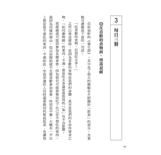 貝園益軒的《養生訓》中,特別鼓勵人們專注於自家產業,並視其為養生的基本。像是和菓子店或小餐廳之類的,想像到店家在開店之前專心準備食材與各項作業時,就會讓人心頭一暖。他們在準備這些東西時都是投入了自己的感情在做事的。