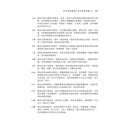 由於105 年初中華郵政公司突在其官網公布,將已實施十數年對外招考新進「專業職(二)外勤」考科中的《郵政法規大意》,由原考之《郵政法、郵件處理規則及郵務營業規章第六章/ 郵件投遞》,更改為《郵政法及交通安全常識( 含道路交通安全規則/第四章、道路交通管理處罰條例及道路交通事故處理辦法)》,可謂變動相當的大。