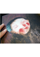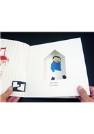 就繪畫技巧而言,作者也非常擅於運用自由的筆觸來表現光影與質感,有的採用透明顏料的乾刷,有的則是不透明顏料的堆疊。而故事中的造型除了銳利邊緣的拼貼效果,也有潦草筆觸的模糊邊緣,這兩種表現形成明顯的對比。我也注意到繪者運用了現成的布紋與花紋做拼貼,還有處處可見暗示性的指紋印,請讀者去觸摸它。這是第一遍無翻譯的閱讀,給我的感覺是:整本書充滿不同的筆觸、質感,還有大膽的造型與鮮明對比的色彩。就設計師的角度來看,除了正常的四色印刷外,每一頁都有不同的加工製版,真的很費工!