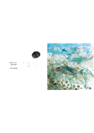 接著,他不斷的問:風是什麼顏色?風是什麼顏色?不管遇到誰,都問同一個問題,答案卻都不一樣,而且都是出乎人的意料。比如有一頁,小小巨人問雨,「風是什麼顏色?」雨什麼都不知道。可是在這一頁裡,我們明眼人一看,整面都是以藍色為主調。小孩,穿著藍衣,站在下雨的森林邊邊。他閉住眼睛,像是在想,像是在感受。我們看到他前面是一大塊的深藍,彷彿聽到雨唏唏哩哩的下著,我看這頁的時候,停了好久。想像自己在聽雨,睜著眼睛聽雨跟閉著眼睛聽雨,有時真的會有很不一樣的感覺。另外還有一頁,當小小巨人涉過一條小溪時,他問:「風是什麼顏色?」那回答讓我「啊」的叫了一聲,那句話是「天空在水裡的顏色」。你注意看那個圖,水裡有魚,也有天,真是水連天,天連水。水天一色,讓人好像一下就整個泡在宇宙大千裡面。但是如果你用手去摸這個畫面,睜眼偷看一下,你會發現,有一圈一圈的漣漪在水面散開。「風是什麼顏色?」你看到後來,會發現作者帶著我們翻書。他告訴我們,風的顏色,什麼都有。整本書上的顏色都有。可是你把書一翻開,會聞到風的香氣。我很想把它叫做書香,然後頁面翻動的時候,會生風,書風。