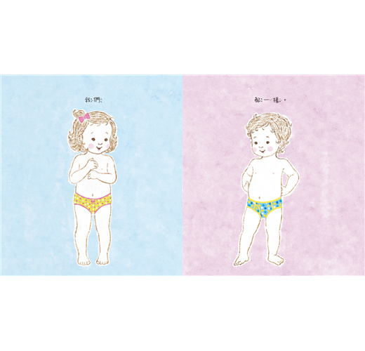 我們都一樣,有眼睛、鼻子、肚臍,但是脫掉內褲之後,男生和女生尿尿的地方就不一樣了。藉由穿上或脫下內褲這個動作,帶出男生和女生的生理構造並不相同。故事最後,又告訴大家,穿上內褲之後,我們都一樣喔,一樣都很珍貴。