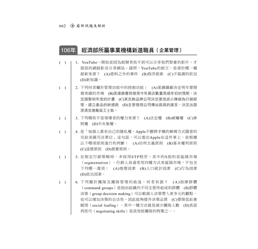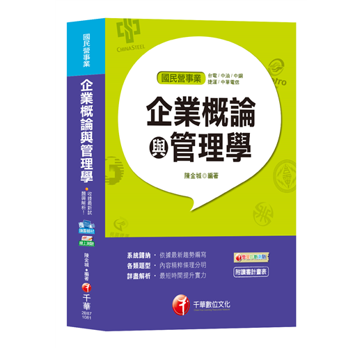 本書歸納交通部及經濟部等所屬國(公)營事業對外甄選,以及其他公職人員考試,依大學「企業管理」、「企業概論」和「管理學」等教科書通用之章節編排。書中除剔除冷僻、過時,不可能再出題的企管概念外,更潛心參酌以上用書及專家名著,並納入最新、最夯的企管概念,精心翻修內容,並將繁雜的企業概論和管理學內容以系統化的方式歸納整理,省去考生苦苦死背整理的時間。相較於市售九流十家企業管理(含大意、概要)考試用書中,本書可說是唯一內容最完整、最充實,確能掌握最新命題趨勢的考試用書。
