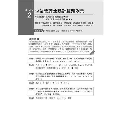 書中內容,除一般考試用書所應有的內容外,還特別將其他出版社企業管理考試用書所沒有的內容納入,即「PART1 企業管理滿分關鍵攻略」中的「最IN管理名詞彙集」與「企業管理焦點計算題例示」。這些內容,在考試時,必為考試成敗的決勝關鍵;而您我皆知,錄取有名額限制的競爭考試,其輸贏又是在一、二分之間,絕對疏忽不得。為協助考生能攻取高分,爰精心特別整理,將其納入;再者,書末也為考生整理了最新試題,並由名師撰寫解析,能夠幫助考生理解考試脈絡,輕鬆上榜非難事。
