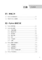 ❑ Python基礎 (1-3章):主要講解Python軟體的基礎、各個重要模組,以及如何解決常見的數據分析問題。此部分可幫助讀者快速上手Python。