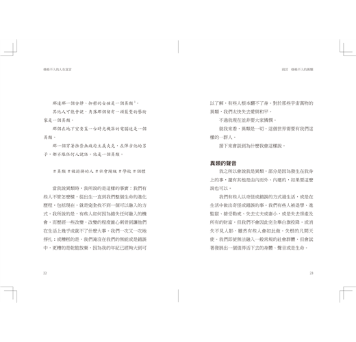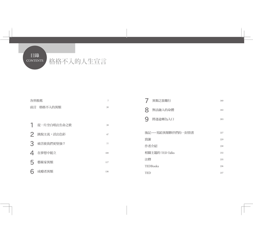 【前言】格格不入的異類 當我說異類(misfit)這一個小小的詞帶有很多含意時,不要懷疑,相信我。先讓我告訴你這個詞並不代表的意思。我現在要說的,不是那些我們偶爾都會感到怪異、寂寞、疲憊、失敗,或是遭人排擠的情況。每一個人在某些時刻都會遭遇到這些經歷,這是人之常情。但我不是在說失序或是難以應付的糟糕感覺,我也不是在說受限於社會角色,或是喪失看待自己的方式,或是面臨中年危機時的衝突感,雖然這些存在狀態確實重要,而且值得看重。 要定義異類這個詞的方式有千百種。多數「現有」的定義包括下列說法:一個與眾不同,...