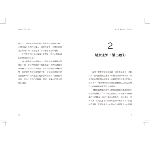 前言 格格不入的異類 第一章 從一片空白唱出生命之歌 第二章 跳脫主流,活出色彩 第三章 痛苦使我們更堅強? 第四章 在夢想中挺立 第五章 藝術家異類 第六章 成癮者異類 第七章 異類之旅難行 第八章 無法融入的身體 第九章 將迷途轉為入口 後記——寫給異類夥伴們的一封情書 後記 致謝 註解 作者介紹