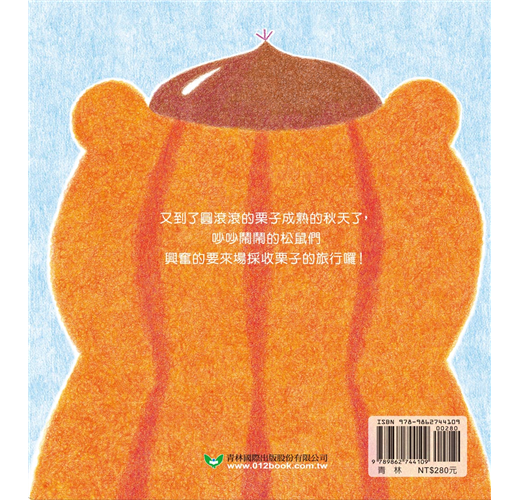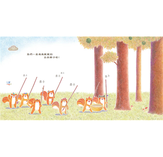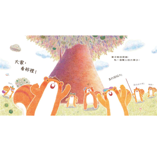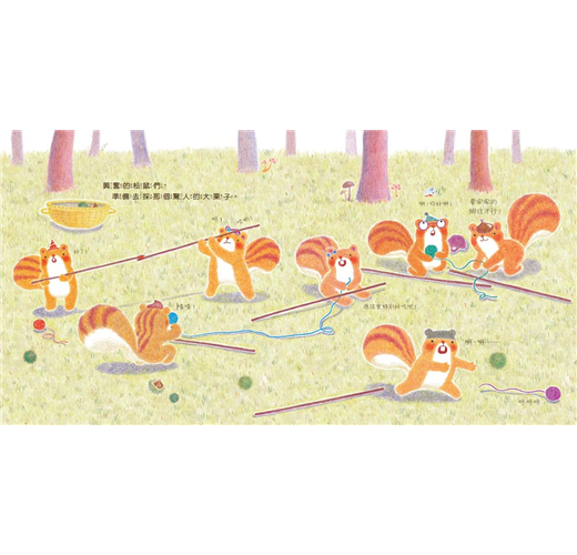 一看到這本書,小編內心就想:「想要出中文版!」因為封面上大大的松鼠實在太可愛啦!翻開內頁,從松鼠前一晚睡覺前在擔心明天要出發去採栗子,不知道會不會下雨開始。這就好像我們旅行前一天,總是擔心不知道天氣如何、是不是還有什麼沒帶到、會不會睡過頭一樣,期待卻又有一點焦慮。書中總共七隻小松鼠,想盡辦法要採到那個巨大的栗子,同心協力的製作道具,互相幫忙、加油打氣的過程讓人覺得好可愛又溫馨呀!一個人不容易做到的事情,透過朋友們的幫忙就變得容易許 多,一起分享合作的成果,更是令人開心,也特別滿足呢!