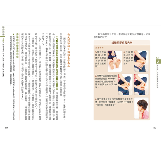 第四單元,則是分享對症腳底與全身按摩法,這些都是很好的保健方法,可改善肩頸痠痛、頭痛耳鳴、幫助睡眠、減輕疲勞和舒緩緊張的情緒。