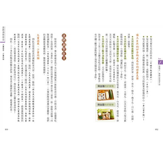 第三單元,則是希望讀者明白不只是靠著喝幾杯蔬果汁和吃對食物就能得到健康,正確且適量的運動也是健康良藥,跟著我練習「養生調息運動」(隨書附贈示範光碟),就能讓你一整天都充滿朝氣活力。