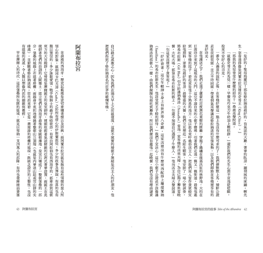 本書有某些傳說故事及隨筆文章,草成的散稿是我住在阿蘭布拉宮期間動筆寫成的,有些則是以當時的筆記、觀察為基礎,隨後增補進來的。文中小心翼翼維持著當地的色彩及寫實性,於是,整個作品或許能夠信實生動地描繪我幸而巧遇、但外在世界非常陌生不解的那個小天地,也就是那個奇特非凡的小小世界。我孜孜矻矻想要想描繪它半西班牙式、半東方式的特性,那種英雄、詩人與怪誕的交融混合。我想喚醒它牆上正在快速消逝的,那些高雅與華美的遺跡。我想記錄那些曾經進出這宮廷的,有關皇室與騎士的傳說,以及如今穴居宮殿廢墟的各色族群裡,他們那些離奇與迷信的傳奇故事。