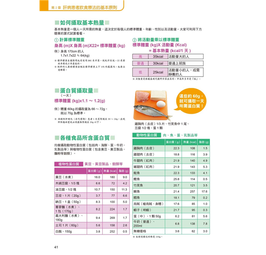 依肝病的原因及症狀,設計合適的飲食菜單。從穀類、根莖類、奶、蛋、肉、海鮮、黃豆及蔬菜各類中,充份使用各種食材,均衡攝取。