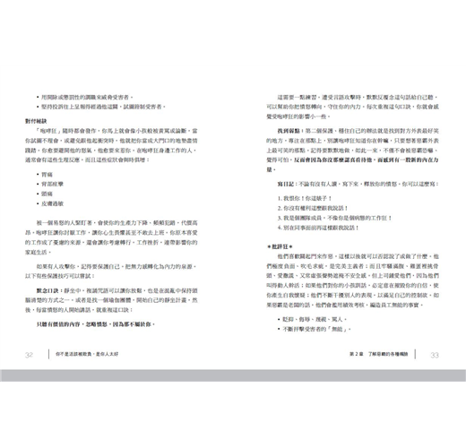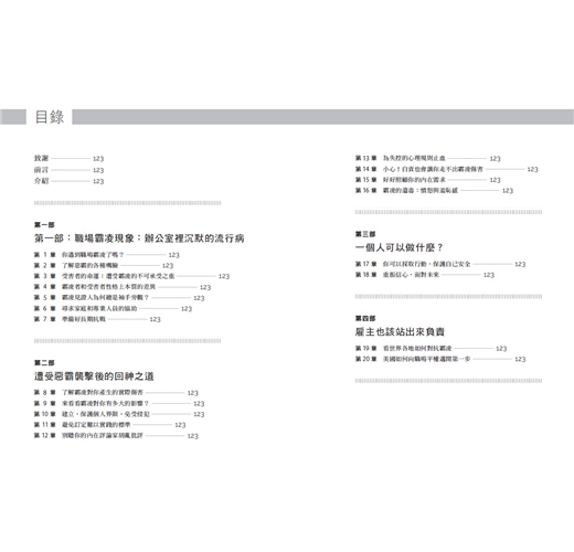 本書中,他們透過邏輯分析、豐富的實務經驗說明,剖析職場霸凌的成因、霸凌者的性格共相,以及容易成為被霸凌者的人格特質、遭遇的困境,幫助工作者快速釐清哪些是霸凌者假藉「受雇機構的需求」,展現控制欲及不合理的對待。本書羅列自我檢視項目、解決對策,並告訴你實用的職場應對技巧,讓你在職場中免於被霸凌的迫害,停止傷害,找回尊嚴,回歸到更健康的工作環境中。