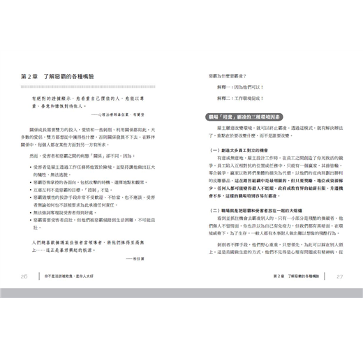 至於其他同事,也必須明白過去的小奸小惡,像是排擠孤立、背後論人是非、給人穿小鞋等,於今都有可能陷自己於法律爭議中。因此,這是一本人人必讀的書,重新省思,接受再教育。──職場作家 洪雪珍