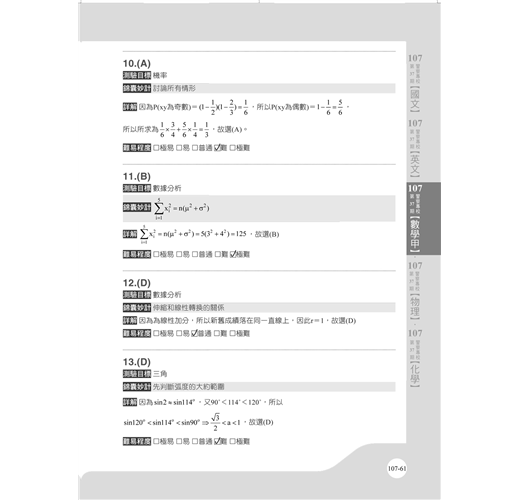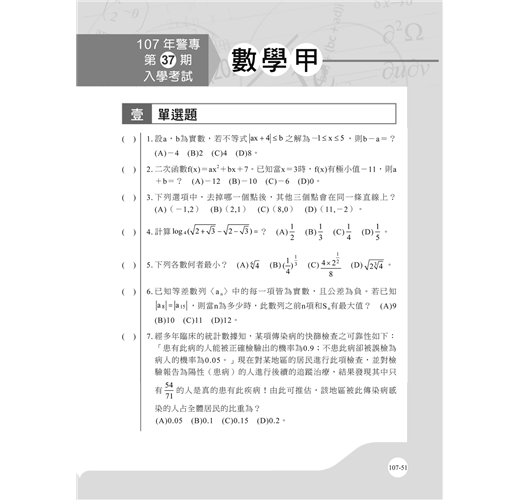 勤做試題不但可以測試自己的實力,發現自己的弱點以便加緊補強,更可了解出題趨勢及命題委員認知的重點,對實力增強有著莫大的助益。尤其甲組考試以數理科目為主,除了觀念完整之外,從做中學才能真正了解理論的應用!