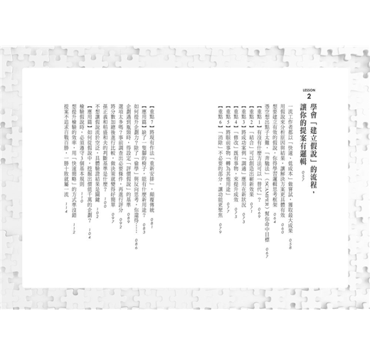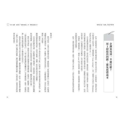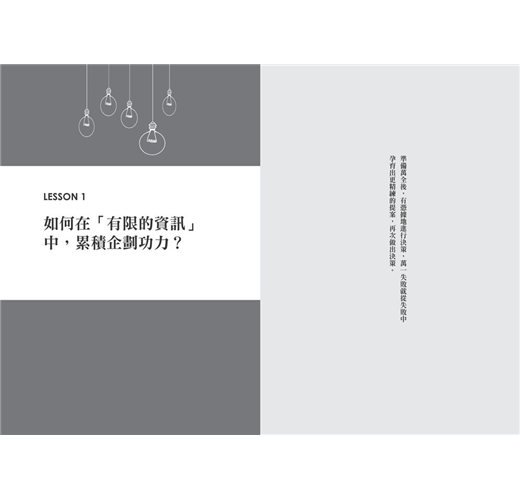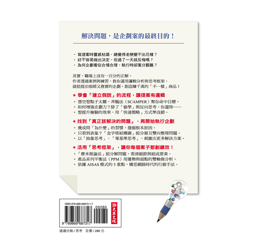 因此,他根據專業知識與經驗,教你奔馳法(SCAMPER)、費米推論法、產品系列平衡法(PPM)、價值鏈分析法等思考框架,並提供應用練習,讓你學會針對問題提出假說,進行驗證與修正,結合既有知識創造出自己的想法。如此一來,你就能突破制約,不再只有一套招式坐困愁城,而且能一次滿足顧客、老闆、廠商對企畫案的挑剔欲望!