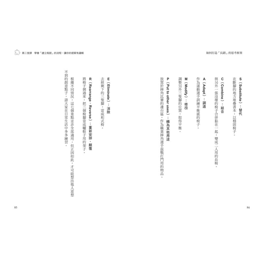 ◎奔馳法(SCAMPER):包含替代、調適、修改、消除、重新安排等7個切入點。