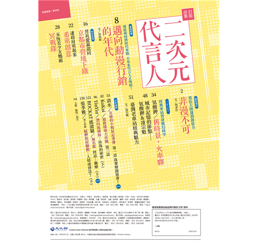 別再說只有現實界俊男美女才是行銷保證,不死系二次元代言人正吸睛。可邀請超高人氣的國際偶像,也能量身訂做專屬擬人代言,造型超乎想像,故事賦予生命,屬性直擊你心。特別專訪用真愛經營角色、誠意博取人氣的「京都地下鐵利用促進計畫」,為公部門打造「高捷少女」等成功角色、揚名國外的「希萌創意」,以及媽祖變身美少女、進而代言西門的《冥戰錄》,並專文深入解析二次元代言風潮與文化,迎接萌經濟時代來臨!