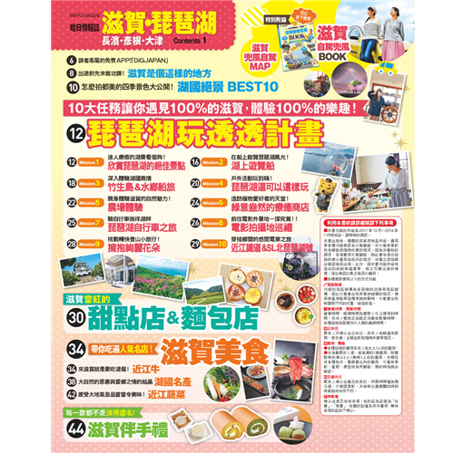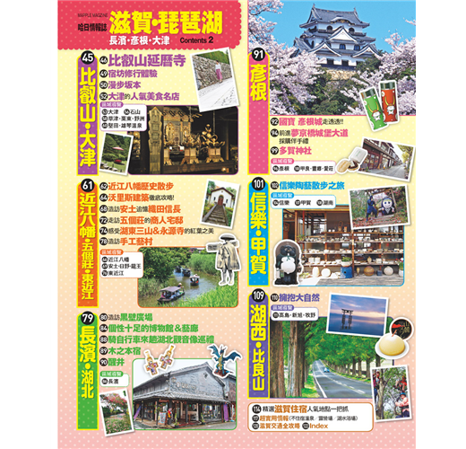 歌川廣重筆下的近江八景展現在眼前,令人流連忘返,這裡盛行遊船賞湖、水上運動、健行、騎腳踏車等運動,可以從不同活動體驗這城市的魅力。因保留歷史街景,及不造作的自然氛圍,這裡也是熱門的電影外景拍攝地,書內提供的10大主題玩法,讓你知道原來旅行有這麼多可能性!