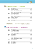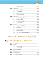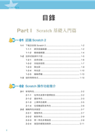 本書以Scratch 2.0版本為主,架構可分為基礎操作與範例實作兩大部分,前兩章針對Scratch的舞台、角色造型、音訊、程式積木的新增與編修做了完整的介紹,之後透過範例循序漸進的引導初學者活用Scratch的各種程式積木。