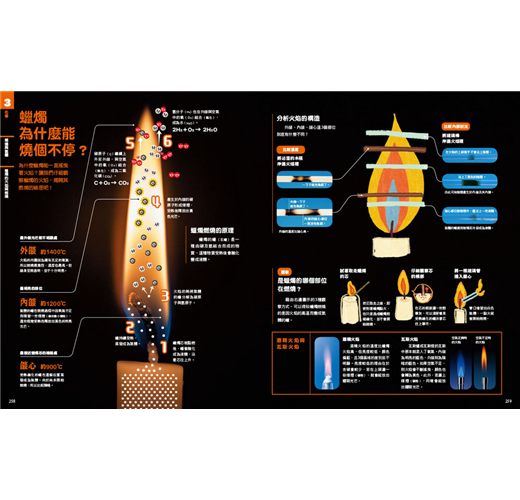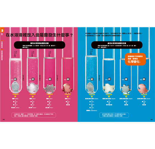 .《NEW全彩圖解觀念化學》大量使用真實圖片,讓我們可以看到反應實際的樣子,像是不同金屬的焰色;此外,在許多地方都輔以視覺化的圖像,無論是蠟燭火焰的粒子模樣、溶解時粒子的情況等,這對於理解微觀的化學世界非常的有幫助。
