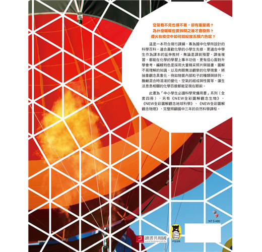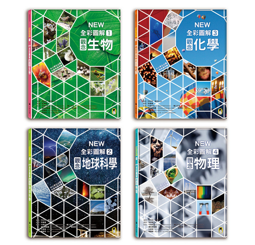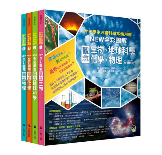 此書為「中小學生必讀科學常備用書」系列(全套四冊) , 另有《NEW全彩圖解觀念生物》、《NEW全彩圖解觀念地球科學》、《NEW全彩圖解觀念物理》,完整照顧國中三年的自然科學課程。