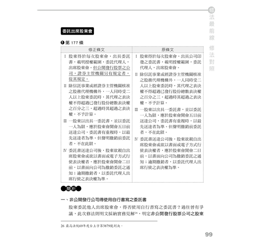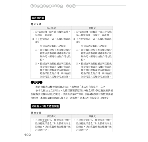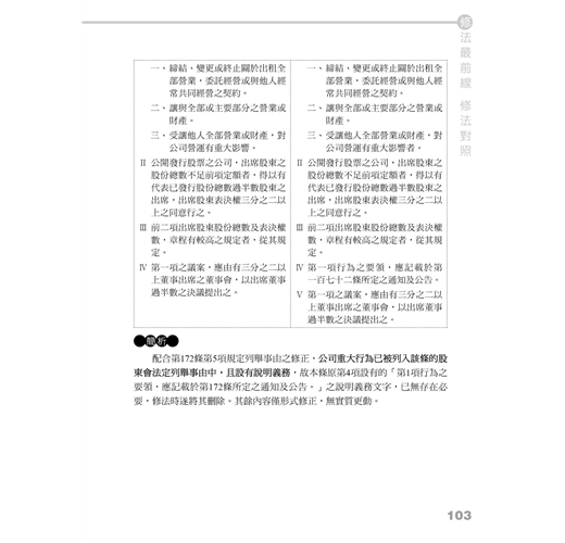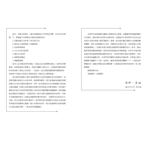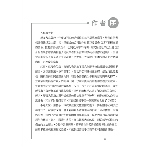 不過大家不用擔心,本次修法條文數量雖然龐大,係對整部公司法底蘊進行了一次徹底改造,將全新的理念灌輸進入現行的公司法體制,但透過本書,我們已經盡力的把所有的概念化繁為簡,幫助大家可以快速的掌握所有修正。此外,閱讀本書前,要先提醒大家的是,對於新增或修正的條文的立法理由,必須作通盤理解,循著過往學習的脈絡思考對應的條文,而非單純檢視新舊條文差異,才能對這部近乎全新的公司法融會貫通。