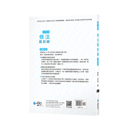 「公司法大幅修正,考生或成最大贏家。」看似詭異的一段話,實際上是想從樂觀的角度表達公司法的修正預告著未來考點的浮現,新修法永遠是國考大熱門,希望這本書能幫各位考生在公司法大幅變動的時代,找到適合自己的節奏,打下一場漂亮的勝仗。