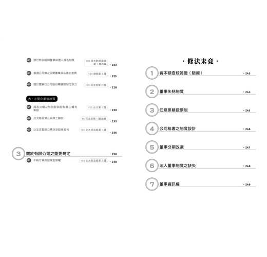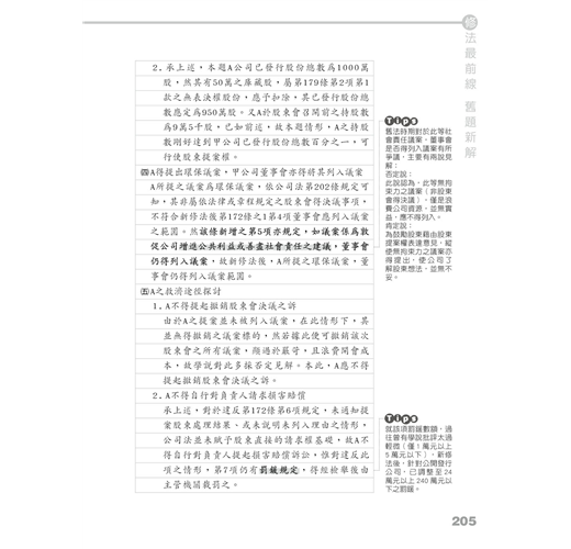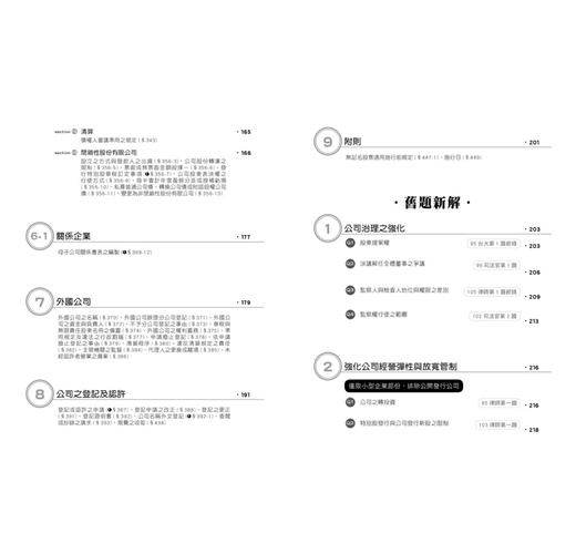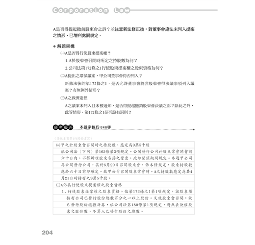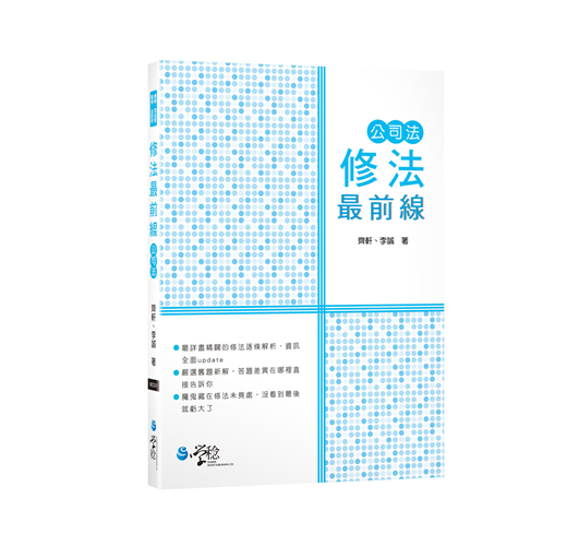 而本書的出版除了讓大家能夠對新公司法的規範內容全面掌握外,也將舊考題以新修正公司法為準,重新撰寫擬答,使大家透過考試題目掌握新修正公司法可能的出題內容。另外,此次修法並未完全接納修正委員會之修法建議,但修正委員會提出的報告仍有相當大的參考價值,因其幾乎總結出目前公司法學者對於舊公司法所有爭議問題的相關建議,該份建議既未被新法全盤接受,可預見的是,除本次修正通過的新法內容外,其當中未被採納的部分(也就是老師們的殘念們XD),重要性肯定也是不言可喻,所以在撰寫本書的過程中,筆者們亦盡可能地將本次修法未盡而被學者提出的重點修正建議,納入本書的內容中,使大家能夠更全面的掌握公司法的最新爭點,一探未來的命題趨勢。
