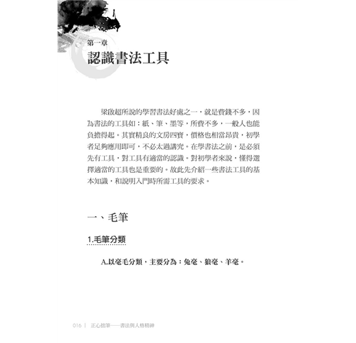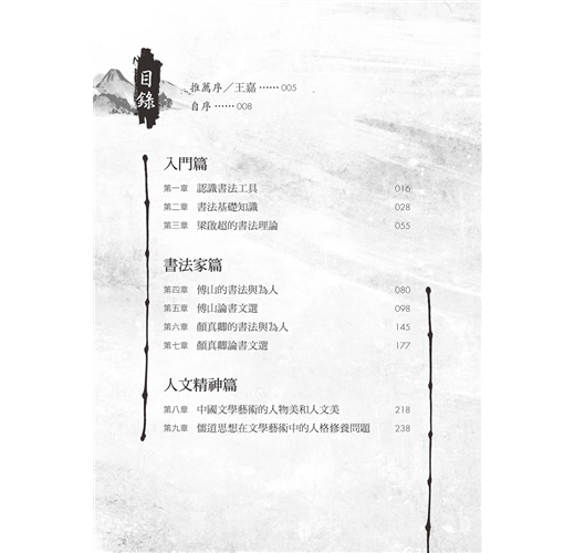 此外,本書亦從入門篇談起,引領初學者認識書法工具、基礎理論,並在歷代書法家中精選出傅山、顏真卿重點論述,最後剖析這門中國藝術所立基的文化精神。層層遞進、深入淺出,不僅是極佳的書法啟蒙讀物,更望能與同道切磋琢磨,共享原道之樂。
