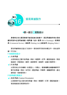 二、術科:涵蓋「基礎貿易英文」、「貿易流程」、「出口價格核算」、「商業信用狀分析」及「貿易單據製作」5大部分,皆附有重點提示,且放入許多模擬試題以加強、驗證學習效果。