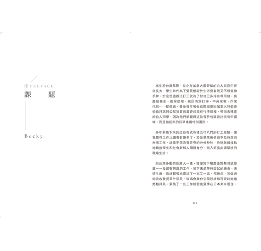 與台灣多數的新鮮人一樣,懵懂寫下履歷後點擊滑鼠按鍵一一投遞有興趣的工作,接下來是等待面試的機會,表情生嫩、情緒緊張地面試了一家又一家,那幾年,我做過物流收發提單外派員、演唱會舞台空間設計和百貨時尚趨勢翻譯員,累積了一些工作經驗後選擇在日本東京居住,進修日文,接下來長時間待在中國工作了一些日子,後來是因為閃電結婚而選擇在台北定居了下來。